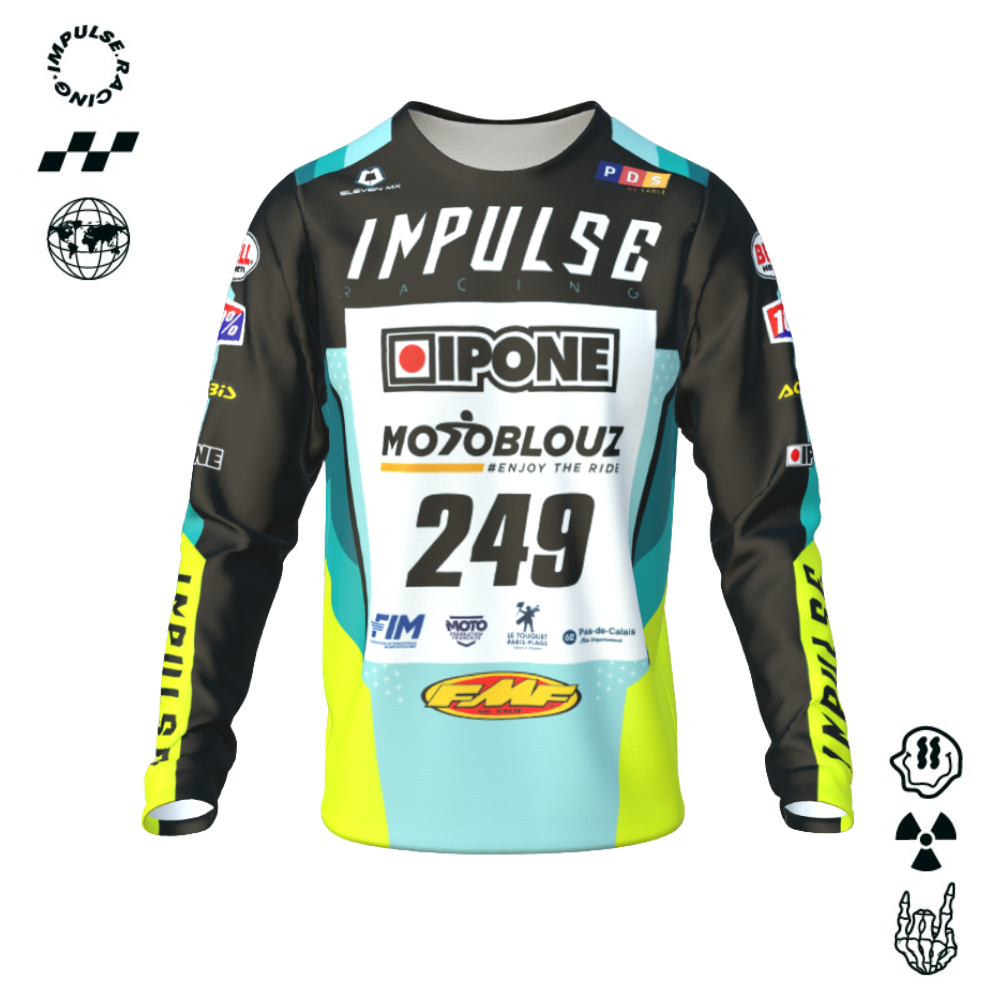Descubre este camiseta de motocross Impulse Tech personalizado con el dorsal oficial de cada prueba del Campeonato de Francia de carreras sobre arena 3AS-racing directamente integrado durante la fabricación en nuestros talleres de Francia. Gracias a nuestro configurador 3D en línea, podrás personalizar este camiseta muy fácilmente: elige la talla de tu camiseta, cambia los colores, añade los logotipos de tus socios y añade tu número en el dorsal oficial de tu carrera sobre arena.