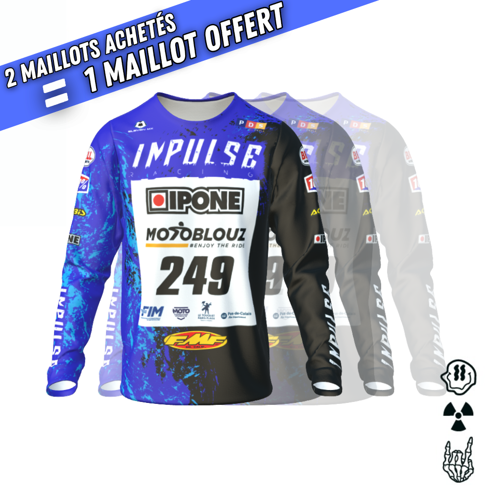 A l'aide de notre configurateur en ligne 3D,  personnalisez votre maillot de motocross Impulse Line avec le dossard officiel de chaque épreuve du Championnat de France de course sur sable 3AS-racing. Choisissez facilement la taille de votre maillot, les couleurs et votre dossard officiel de course sur sable. Vous pouvez même importer les logos de vos partenaires.